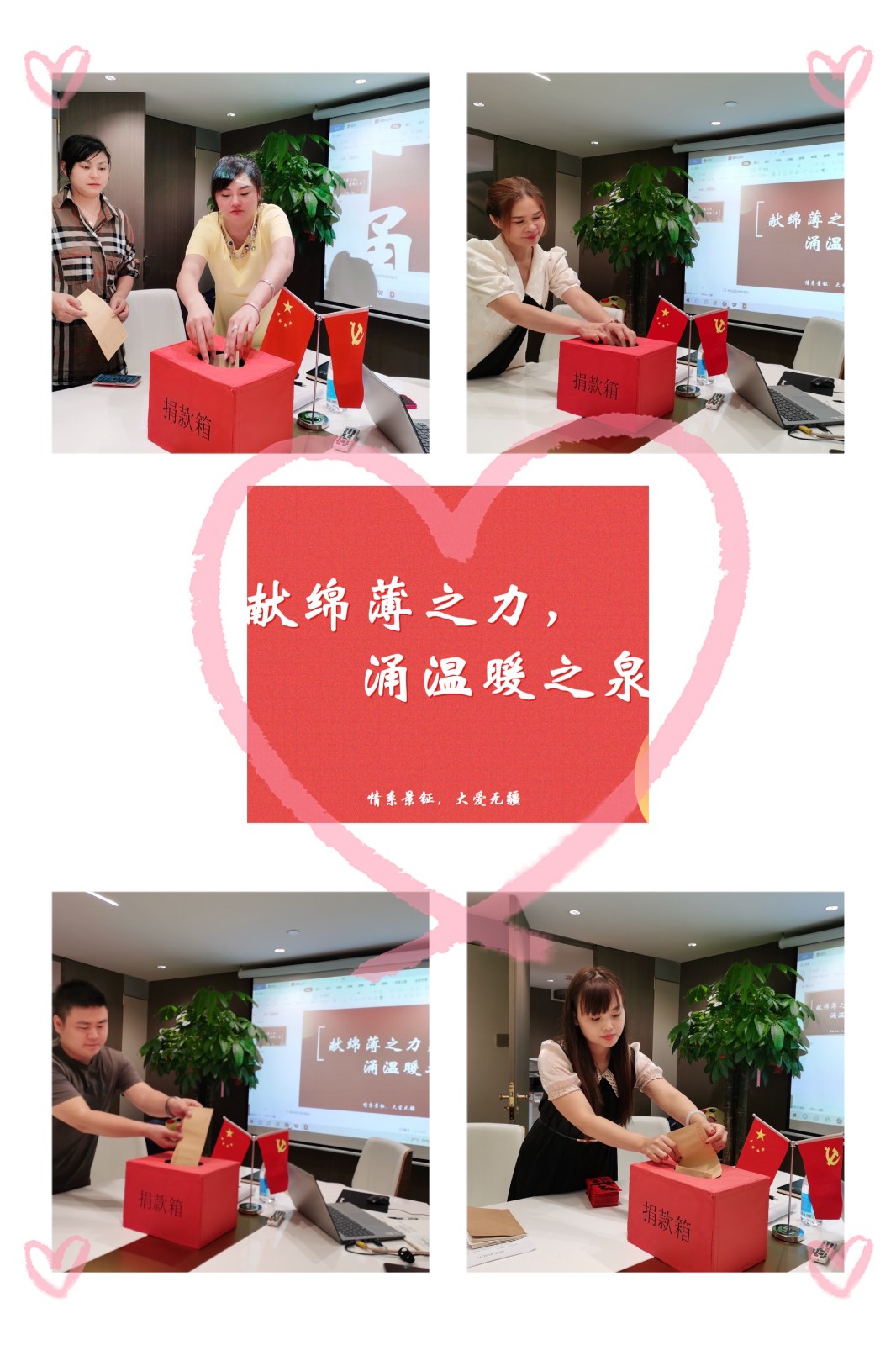 善行不论先后,爱心不分大小,景钲大家庭的每一位成员都积极将自己的一份爱心投进捐款箱中。一份小小的爱心,汇成温暖的海洋,凝聚爱与光芒。